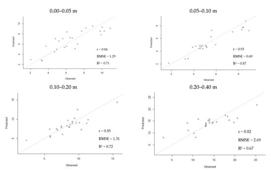 Validation of the Random Forest model to predict soil carbon stock for different land use systems: r—correlation coefficient, RMSE—root-mean-square error, and R2—determination coefficient.