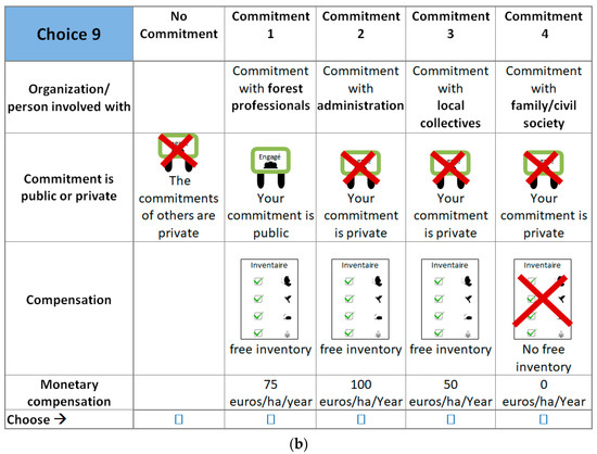The second step of our choice experiment consists in defining combinations of alternative commitments and their combination in choice situations. We decided to let each respondent participate in two DCEs. The first DCE did not include the monetary incentive attribute (see Figure 2a), while the second DCE included monetary and non-monetary incentives (Figure 2b).