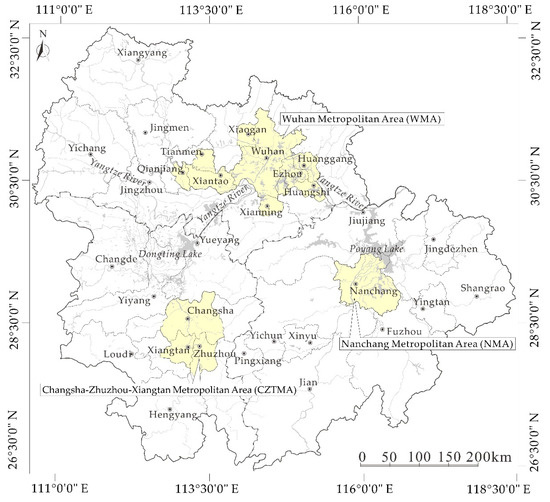 The UAMRYR is located in Central China (110°23′~118°28′ E; 26°29′~32°30′ N), covering 31 cities in Hubei, Hunan, and Jiangxi provinces, with a total area of about 317,000 km2, as shown in Figure 1. In 2020, the region’s population reached 129.16 million, including an urban population of about 79.24 million. It is the second-largest urban agglomeration in China, second only to the urban agglomeration in the Yangtze River Delta (UAYRD). The UAMRYR is rich in forest resources. In 2020, the total forest area was 144,953.79 km2, accounting for 45.72% of the total regional area, and the forest volume was estimated at 1.60 billion m3 [57]. Urban expansion in the UAMRYR has accelerated in recent years, especially in the Wuhan metropolitan area (WMA), the Changsha–Zhuzhou–Xiangtan metropolitan area (CZTMA), and the Nanchang metropolitan area (NMA) [58]. In the WMA, Wuhan serves as the core, with eight surrounding cities: Huangshi, Huanggang, Ezhou, Xiaogan, Xianning, Xiantao, Tianmen, and Qianjiang. The CZTMA consists of Changsha, Zhuzhou, and Xiangtan. Additionally, in the NMA, Nanchang serves as the core to the surrounding small towns. Forest loss occurs in all 31 cities of the UAMRYR but is more significant in these three metropolitan areas [59].
