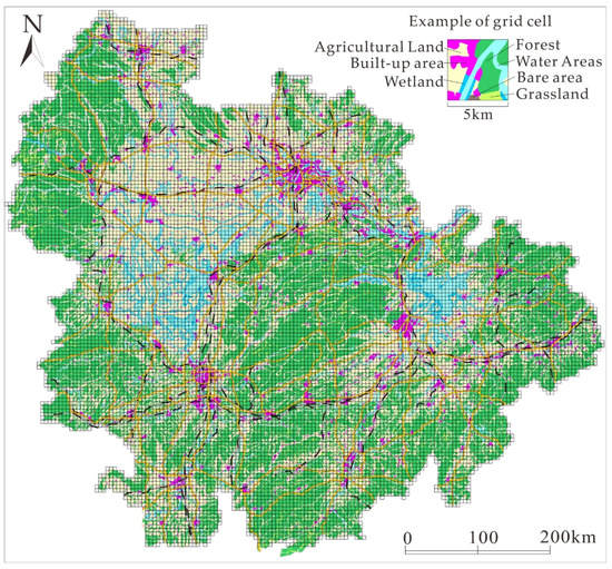In the urban agglomeration, forest loss and landcover change are extremely complex and difficult to quantify or describe directly. A grid system helps standardize complex changes and unify the spatial system for statistical operation. The smaller the area and the greater the number of cells in the grid system, the more accurate the calculation results would be, but the number of calculations would also increase. Therefore, the area and number of cells need to be determined according to the scale of the research region. Considering the spatial scale of the UAMRYR and the feasibility of operation, a grid system was used in the analysis, containing 12,780 5 km × 5 km grid cells [65]. Using the Partition Statistical function in ArcGIS, the total area for each landcover type in each cell was calculated for the years 1990, 1995, 2000, 2005, 2010, 2015, and 2020. Through temporal analysis, the areas of forest loss and landcover change for each cell were calculated. Additionally, the area of forest loss sorted by the cause and extent of afforestation in each cell was calculated for each of the six periods (i.e., 1990–1995, 1995–2000, 2000–2005, 2005–2010, 2010–2015, and 2015–2020). The grid system was then used to show the overall forest loss, the distribution of forest loss classified according to cause, and the afforestation distribution in the UAMRYR, as shown in Figure 2.