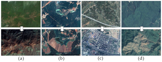 Reason classification of forest loss: (a) forest loss caused by fire; (b) forest loss caused by logging; (c) forest loss caused by construction; (d) forest loss caused by pollution.
