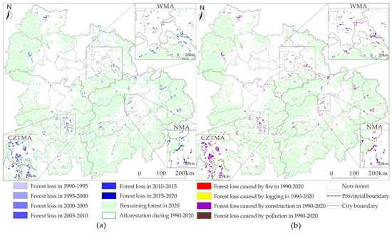 Spatiotemporal loss of forest in UAMRYR: (a) forest loss in 6 periods during 1990–2020; (b) distribution of forest losses caused by various reasons during 1990–2020.