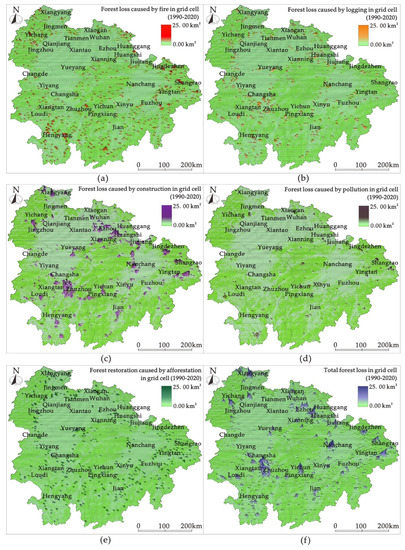 Spatial distribution of forest loss and afforestation: (a) spatial forest loss caused by fire; (b) spatial forest loss caused by logging; (c) spatial forest loss caused by construction; (d) spatial forest loss caused by pollution; (e) spatial forest restoration caused by afforestation; (f) spatial distribution of total forest loss.