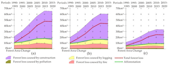 Forest loss curves of the metropolitan areas: (a) Changsha–Zhuzhou–Xiangtan metropolitan area; (b) Wuhan metropolitan area; (c) Nanchang metropolitan area.