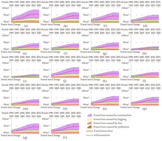 Forest loss curves of 18 cities: (a) Xiangyang; (b) Jingmen; (c) Yichang; (d) Jingzhou; (e) Yueyang; (f) Loudi; (g) Hengyang; (h) Changde; (i) Yiyang; (j) Yichun; (k) Pingxiang; (l) Xinyu; (m) Jian; (n) Fuzhou; (o) Yingtan; (p) Jiujiang; (q) Jingdezhen; (r) Shangrao.