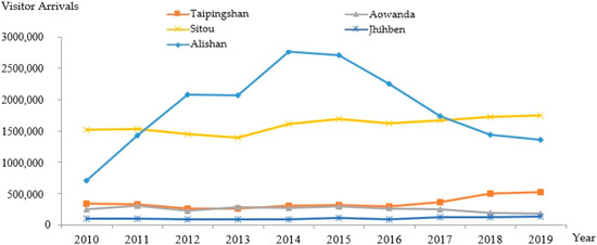 - Alishan Forest Recreation Area. Statistics of Scenic Spots. Available online: https://recreation.forest.gov.tw/Forest/RA?typ=0&typ_id=0500001 (accessed on 14 October 2020).