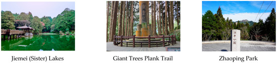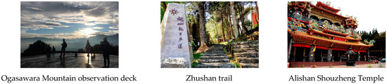 In addition to the giant trees, the ANFR has many popular scenic sites: the forest train, the misty Jiemei (Sisters) Lakes, the moving sea of clouds, the dazzling sunrise from Zhushan, and other attractions studied in this research, including Ogasawara observation deck, Zhushan Trail, Alishan Shouzheng Temple, Jiemei (Sister) Lakes, Giant Trees Plank Trail, and Zhaoping Park (Figure 3). The ANFR is an international tourism destination that sufficiently represents the cloud forest belt in Taiwan. Furthermore, due to the forest recreation area’s situation at a mid-high altitude in a relatively remote mountainous region, visiting tourists predominantly opt for travel itineraries of more than 1 day [33]. These features draw many tourists to this area and, therefore, estimating the recreation value of Alishan is crucial for regional development.