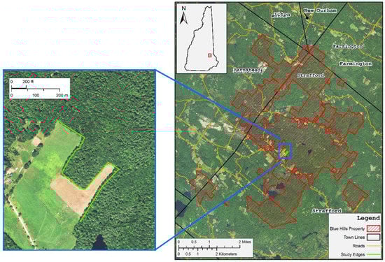 This research was conducted on the Blue Hills Foundation conservation lands in New Hampshire, USA (Figure 1). The area covers 2946.95 ha and spans five New Hampshire towns. This property is owned by the Blue Hills Foundation Inc. and managed by the Harvard Forest. This stand represents a natural, highly mixed, transition hardwood-hemlock-white pine forest community as described by Westveld [67] or a Hemlock-beech-oak-pine forest as discussed in Sperduto and Nichols [68]. White pine (Pinus strobus) and eastern hemlock (Tsuga canadensis) are the dominate species in the forest followed by red maple (Acer rubrum), red oak (Quercus rubra), red pine (Pinus resinosa), and American beech (Fagus grandifolia). Our study site and corresponding edges were carefully selected due to their proximity to a suitably sized field for UAS flying and adjacency to continuously maintained fields because it represents a predominately southern edge exposure, and because these edges are considered older (>30 years old) [3].