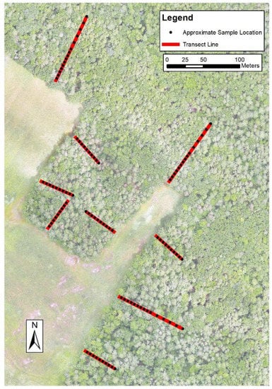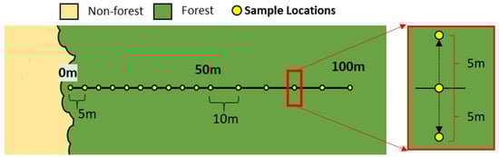 To establish a reference for the edge effects in the study area, a traditional ground data collection of foliage cover (i.e., the vertical projection on the ground of the forest canopy including within crown gaps) was conducted. Ground data was collected between 28 September 2019 and 30 September 2019. Nine transects running perpendicular into the forest were established along an approximately 944 m length of forest edge. A random point along this edge was chosen for the placement of the first transect. Subsequent transects were spaced 100 m apart and/or >50 m from a corner [8,10,24,25]. Figure 2 shows the general sampling setup along each transect. The transect bearing was chosen as the azimuth perpendicular to the edge with the 0 m distance point placed on the edge line. The edge line was considered the inside edge of any stone walls if present, or the outermost extent of the tree stems within roughly 10 m of either side of the transect location. Once the starting position and bearing were established, sampling locations were placed systematically along the transect line. Sample spacing was 5 m within the first 50 m and then was increased to 10 m between 50 m–100 m. The sampling intensity was higher up to 50 m because edge effects have commonly been found to extend 50 m or less into the forest [3,5,37,69]. Not every transect line extended 100 m out. Transect distance alternated between 50 and 100 m except in the case where a 100 m distance would place the end of the transect within 50 m of a second edge. In addition to a sample point being taken along the transect line at the specified distance interval, two more samples were taken 5 m perpendicular on either side of the centered point. Thus, for each distance, three samples were collected.