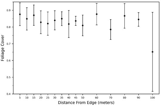 Average ground-based foliage cover (FC) for each sampled distance across all transects. Bars represent the 95% confidence interval around the mean. FC is shown as decimal percentages between 0 and 1 with 1 indicating 100% cover.