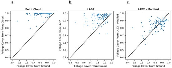 Comparison between the estimates of foliage cover (FC) generated from the (a) normalized photogrammetric point cloud, (b) the UAS orthomosaic using the LAB2 method, and (c) the UAS orthomosaic using the modified LAB2 method. The solid black line indicates the 1:1 relationship. FC is shown as decimal percentages between 0 and 1 with 1 indicating 100% cover.