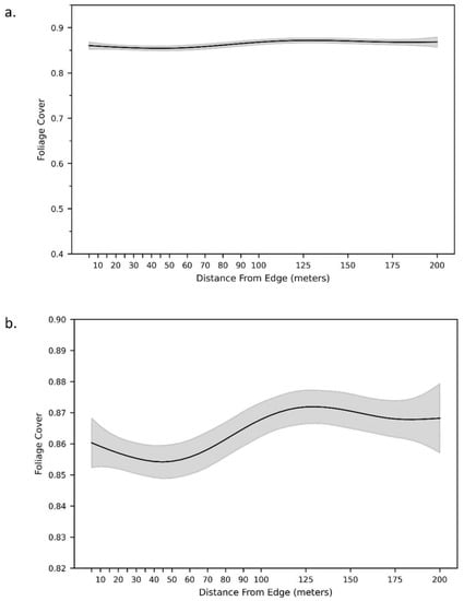 Results of the GAM model based on the modified LAB2 estimates of foliage cover (FC). Plots show the trend in FC with distance from edge for the same model but with different Y-axis scales. The Y-axis scale for (a) matches the scale of the axis in Figure 4. The Y-axis in plot (b) is narrowed to visualize the trend better. The shaded area represents the 95% confidence interval. FC is shown as decimal percentages between 0 and 1 with 1 indicating 100% cover.