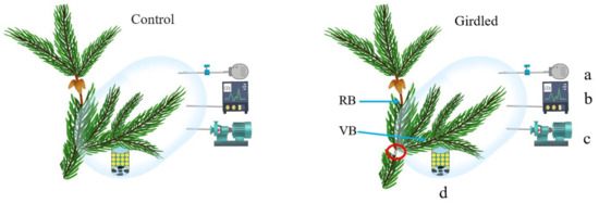 Scheme of the 13CO2 pulse labeling experiment. In each selected tree, a pair of branches were either ungirdled (Control) or girdled (Girdled; red circle) (n = 6) at the insertion point. The lateral branch bearing no cones (i.e., vegetative branch; VB) was labeled with 13CO2 to evaluate potential transport of assimilated 13C to the apical reproductive branch (RB). a: Infusion of 13CO2; b: CO2 infrared gas analyzer; c: Infusion of CO2-free air, prepared by passing ambient air through soda lime; d: Electric fan with silica gel.