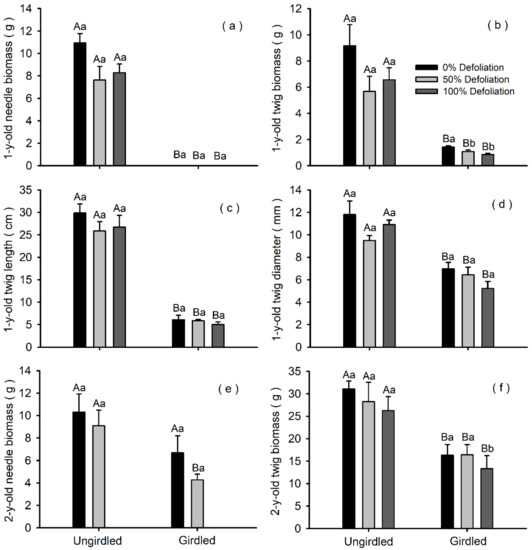 Needle and twig biomass and twig dimensions (length and diameter) of one-year-old (Y1; a–d) and two-year-old (Y2; e,f) Pinus koraiensis branches in response to girdling and defoliation treatments. One-year-old needle biomass was nil in girdled branches. Bars and arrows represent the mean and corresponding standard error, respectively, per treatment combination. Different capital letters indicate a significant effect of girdling for a given defoliation intensity (p < 0.05). Different lowercase letters indicate significant differences among defoliation intensities for a given girdling group (p < 0.05). Means were compared using LSD tests.