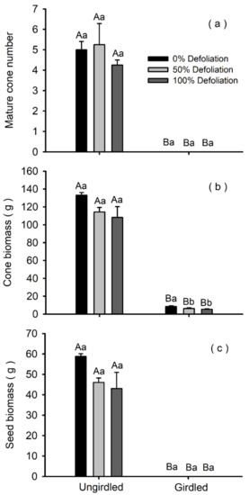 Number of mature cones (a) and cone and seed biomass (b–c) in response to girdling and defoliation treatments in Pinus koraiensis. The number of mature cones and the seed biomass were nil in girdled branches. Bars and arrows represent the mean and corresponding standard error, respectively, per treatment combination. Different capital letters indicate a significant effect of girdling for a given defoliation intensity (p < 0.05). Different lowercase letters indicate significant differences among defoliation intensities for a given girdling group (p < 0.05). Means were compared using LSD tests.