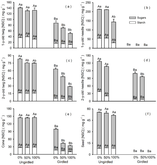 Non-structural carbohydrate concentration ([NSC]) of one-year-old (Y1; a, b and e) and two-year-old (Y2; c, d and f) Pinus koraiensis branches in response to girdling and defoliation treatments. One-year-old needle and seed [NSC] was nil in girdled branches. Bars and arrows represent the mean and corresponding standard error, respectively, per treatment combination. Different capital letters indicate a significant effect of girdling for a given defoliation intensity (p < 0.05). Different lowercase letters indicate significant differences among defoliation intensities for a given girdling group (p < 0.05). Means were compared using LSD tests.