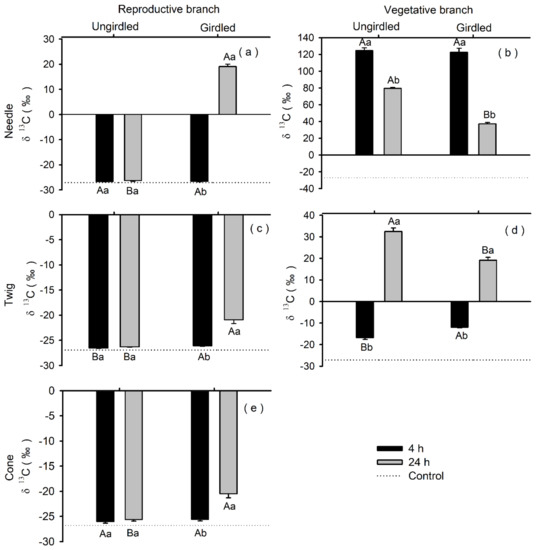 Carbon isotopic composition (δ13C) in needle (a,b), twig (c,d), and cone (e) tissues after 4 h and 24 h of the 13CO2 labeling pulse to which vegetative branches of Pinus koraiensis were subjected. Each tandem of branches was girdled or remained ungirdled (n = 6). Dotted lines indicate the baseline δ13C measured in unlabeled trees (control). Bars and arrows represent the mean and corresponding standard error. Different capital letters indicate significant differences between girdling treatment levels for a given harvesting time (p < 0.05). Different lowercase letters indicate significant differences between harvesting times for a given girdling treatment (p < 0.05). Means were compared using LSD tests.