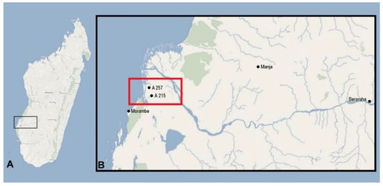 Map of Madagascar (A) with a detail of the investigated area, showing also the positions of the two baobabs in the red square (B).