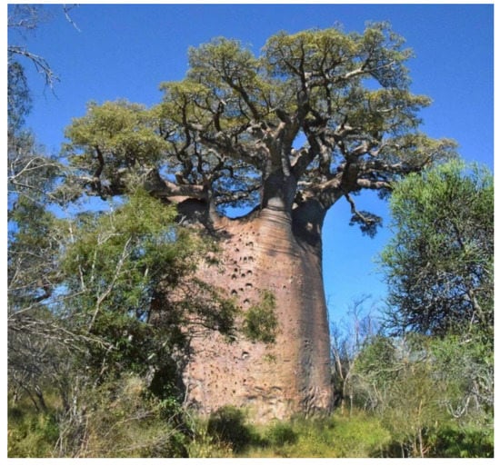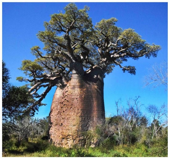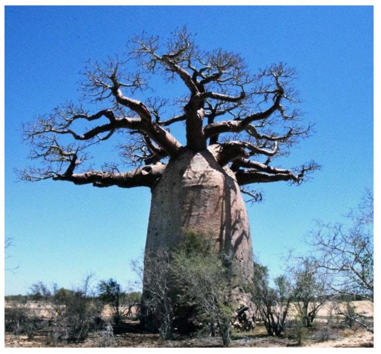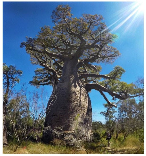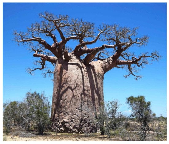 Over the past years, our research on baobabs mainly focused on the most famous species of Madagascar, namely the Reniala (in Masikoro, i.e., “Mother of the Forest”). According to the classical description, the Grandidier baobabs are presented as large trees with columnar trunks, flat-topped crowns and quasi-horizontal large branches []. However, the dimensions and shape of mature and old individuals may vary substantially, and the differences depend especially on the location. Thus, the specimens in the Morondava area, where the famous Avenue of Baobabs is located, are tall and rather slim (with heights up to 25–30 m and circumferences around 8–13 m), while the Andavadoaka area is dominated by bottle baobabs resembling corpulent dwarfs (with heights of 4–10 m and circumferences up to 10–13 m) and have trunks with many hollows (like a slice of Emmenthaler). The largest A. grandidieri, which have very massive trunks (with heights of 12–18 m and circumferences up to 29 m), are located close to Morombe, in the so-called Andombiry Forest.