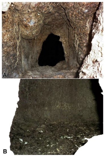 The entrance to the false cavity of A 257 (A). The exterior of the entrance (B). The interior of the false cavity illuminated with a flashlight.