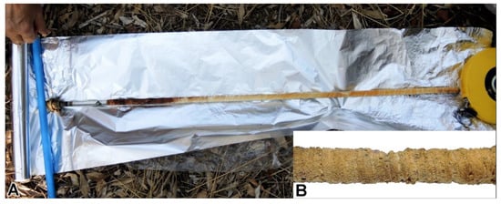 The wood samples were collected with a Haglöf CH 800 increment borer (0.80 m long, 0.0108 m inner diameter) and wrapped in tin foil until the subsequent selection of the segments for dating (Figure 8). After each coring, the increment borer was cleaned and disinfected with methyl alcohol. The small coring holes were sealed with Steriseal (Efekto), a special polymer sealing product, for preventing infection.