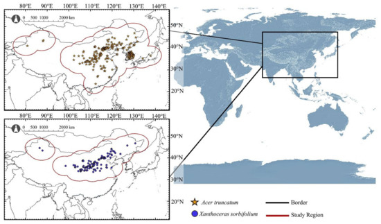 In this study, areas of 500 km radius outside all the occurrence records of A. truncatum and X. sorbifolium, respectively, were set as buffers. Then, all the buffers were superimposed to form a buffer of study region for each species (Figure 1). The two study regions formed included all possible migration events under future climatic conditions and reduced extrapolations when projecting under other or larger dominant climate conditions. These two species are widely distributed in the natural environment and cross geographic barriers such as mountains and oceans in the study area, so geographic factors can be ignored. At the same time, study regions also contained the candidate areas that species may reach in the future as a result of assisted migration [27].