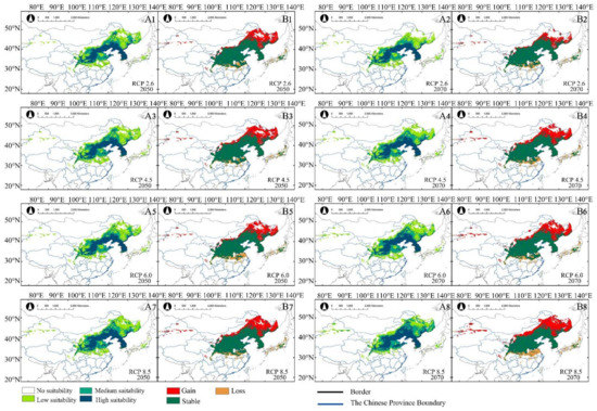 Under future climate change scenarios (2050s and 2070s), (A1−A8) are potentially suitable distributions of X. sorbifolium. (B1−B8) are the area changes of X. sorbifolium compared to the distribution under current climate scenario.
