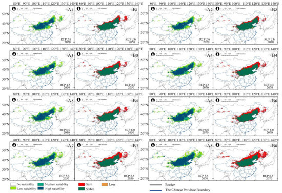 The change pattern of potential distribution was similar between X. sorbifolium and A. truncatum. With the increase in greenhouse gas emission, the total suitable habitats increased. The area of low suitability increased greatly under future climate scenarios (Table 2). The proportion of increase was also significantly higher than that of loss in suitable habitats (Table 3 and Figure 5A1–A8). The areal dynamics of X. sorbifolium in future climate scenarios were shown in Figure 5. Different from A. truncatum, the gained area of X. sorbifolium was mainly distributed in the Northeast China Plain and Inner Mongolia Plateau. At the same time, suitable habitats also appeared in some western regions of China (Xinjiang and Qinghai of China). The stable area of X. sorbifolium was mainly in the Loess Plateau, and the lost area was in the south of the Loess Plateau (Figure 5B1–B8). The area changed the most intensely under RCP 8.5—2070 compared with the other future climate scenarios. The high, medium, and low suitable areas of X. sorbifolium took up 58.37 × 104 km2, 32.34 × 104 km2, and 102.19 × 104 km2, respectively (Table 2). The area of low suitability increased significantly, compared with the current distribution of suitable habitats (Table 3 and Figure 5A8,B8). It was inferred that the increase in greenhouse gas emissions had a great impact on the change of both species’ suitable habitat.