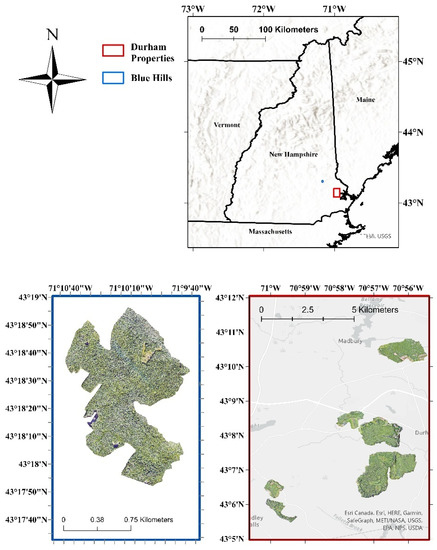 A combination of nine forested properties, located in southeastern New Hampshire were studied during this research. The properties included a total of 605.15 hectares (ha) of forested land comprising a variety of species compositions, forest successional classes, and stand structures (Figure 1). These sites were selected due to their availability of field-based inventory data (i.e., Continuous Forest Inventory (CFI) plots), and because of their limited management. The average size of these properties is 70.36 ha, while the smallest (Moore Fields) contains 17.2 ha of forested land cover. All but one of the properties, the Blue Hills Foundation lands, are owned and managed by the University of New Hampshire (Figure 2). These include College Woods, Kingman Farm, Thompson Farm, Moore Fields, East Foss Farm, West Foss Farm, Dudley, and Burley-Demeritt [63]. The Blue Hills study site is a contiguous forest conservation land, managed by the Harvard Forest.