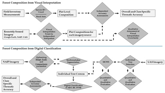 Flow chart outlining the methodology used for the visual interpretation and digital classification assessments of fine-scale forest composition.