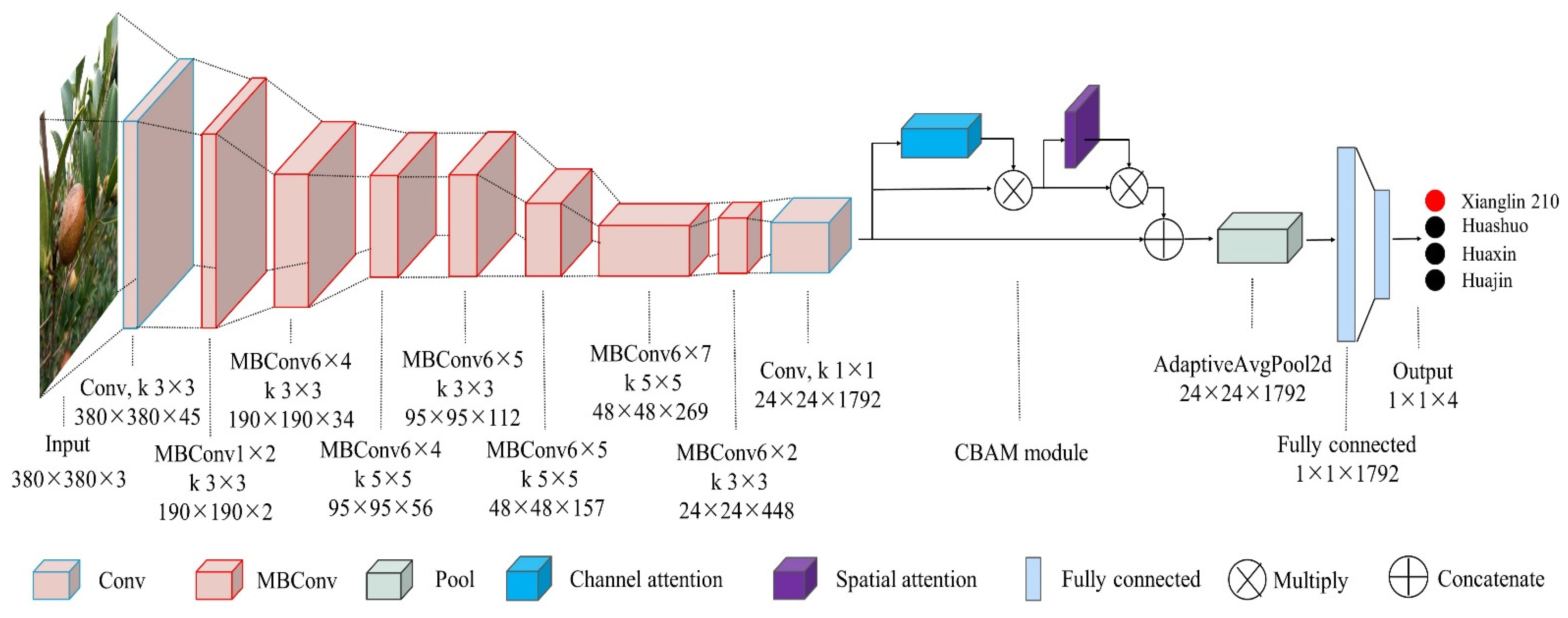 Zhu, X.; Zhang, X.; Sun, Z.; Zheng, Y.; Su, S.; Chen, F. Identification of Oil Tea (Camellia oleifera C.Abel) Cultivars Using EfficientNet-B4 CNN Model with Attention Mechanism. Forests 2022, 13, 1. https://doi.org/10.3390/f13010001