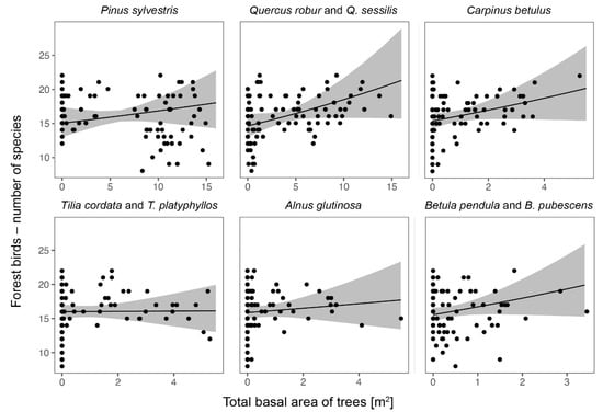 Relationships between species richness of forest birds (N/10 ha) and total basal area of trees thicker than 20 cm DBH (m2/0.45 ha), estimated using generalized linear models (GLMs) with log link function (Table 4). Dots represent measured values, line—prediction, gray area—95% confidence interval for prediction.