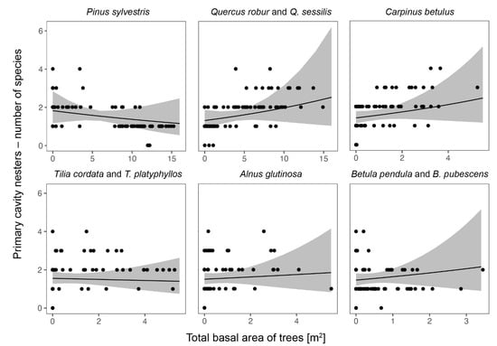 Relationships between species richness of primary cavity nesters (N/10 ha) and total basal area of trees thicker than 20 cm DBH (m2/0.45 ha), estimated using generalized linear models (GLMs) with log link function (Table 5). Dots represent measured values, line—prediction, gray area—95% confidence interval for prediction.