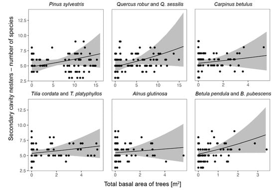 Relationships between species richness of secondary cavity nesters (N/10 ha) and total basal area of trees thicker than 20 cm DBH (m2/0.45 ha), estimated using generalized linear models (GLMs) with log link function (Table 6). Dots represent measured values, line—prediction, gray area—95% confidence interval for prediction.