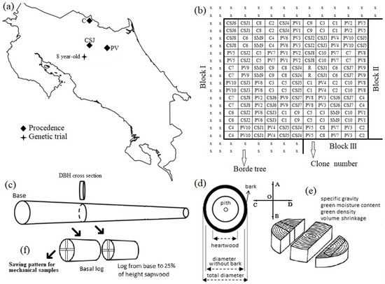 (a) Geographic location of the provenance/progeny trial of 8-year-old Dipteryx panamensis, northern region of Costa Rica: Coope San Juan (CSJ), Puerto Viejo (PV), and Crucitas (C) provenances. (b) Distribution of families within the block. (c) Sampled cross-section extraction from stem. (d) Parameters measured in cross-section and (e) cut pattern of cross-section for physical properties determination. (f) Sawing pattern for mechanical properties.