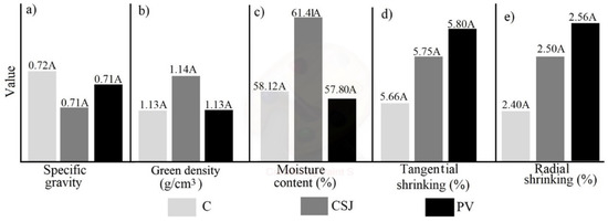 The values of BP, HWP, and SWP found for the different families (Table 1) are lower than those reported by Tenorio et al. [22] for D. panamensis trees. The values found for physical properties (SG, MC-G, GD, TS, and RS) and the different mechanical properties studied (MOR and MOE in bending test, compression stress, shear stress, and Janka hardness) for the different origins (Figure 3) and the different families (Table 2) of 8-year-old D. panamensis present some differences from those reported by Tenorio et al. [22] for D. panamensis trees from 13-year-old plantations. For example, these authors report higher values of SG, MC-G, GD, TS, and RS than those found in this study (Table 2), resulting in higher mechanical property values in the wood of Tenorio et al. [22]. On the other hand, the highest values of SG, GD, RT, and TS were reported for wood from trees growing in a natural forest [23], values higher than those obtained in this study for the different provenances (Figure 2) and the different families (Table 2).