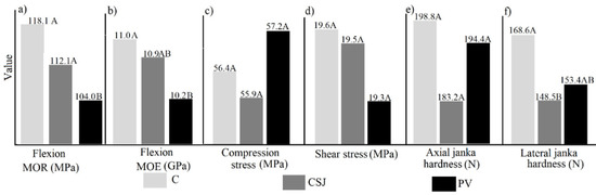 The statistical analysis of the mechanical properties showed statistically significant differences between the three provenances evaluated in the MOR and MOE of the flexion test and lateral Janka hardness (Figure 3a,b,f), but for other mechanical properties no statistically significant differences were found. The MOR values from the bending test were lower for the PV provenance than for the other two provenances (Figure 3a), while for the MOE, the C provenance was superior to CSJ and PV (Figure 3b). The compressive strength in shear and axial Janka hardness did not differ between provenances (Figure 3c–e), while in lateral compression Janka hardness, the C provenance was superior to CSJ and PV (Figure 3f).