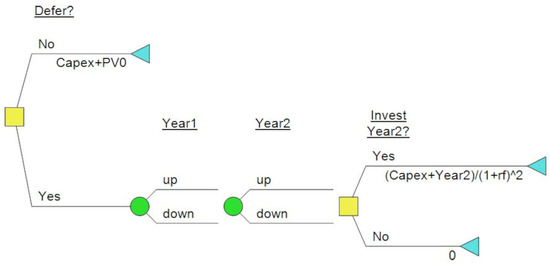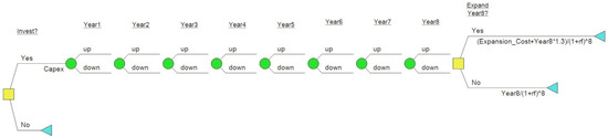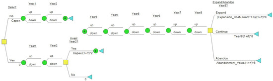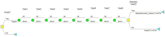 According to [79], we build the binomial tree model using DPL decision analysis software [80]. We used the market asset disclaimer (MAD) approach for modeling, so we assumed that the underlying asset was the value of the project without any flexibility [76]. We modeled the investment projects with the management flexibility provided by the application of four different real options models.