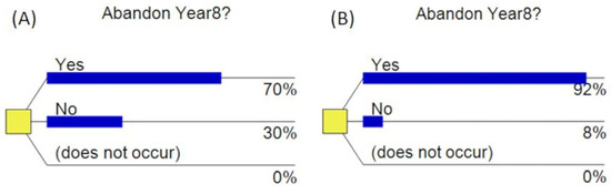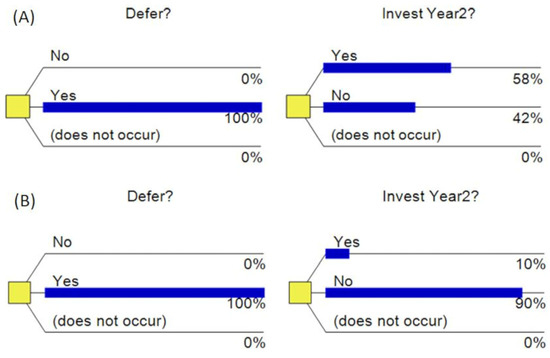 In this period, the greatest probability would be that an investment should occur for the land lease project (Figure 5A), mainly because the project already has a positive NPV. On the other hand, the greatest probability would be that the option was expired, and no investment occurred in the project with land purchase (Figure 5B). As the uncertainty increases, the probability of the project being implemented at that moment decreases [96].
