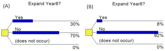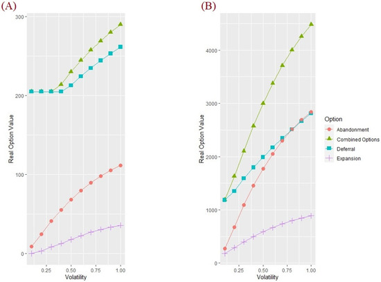 In the project with land purchase, the low probability of exercising the option to expand (8%) explained why valuation was lower compared to the other options (Figure 6B). When indicating non-expansion, it means that the present value of the project’s expected cash flows, if expanded, would not exceed the additional disbursement needed to finance the expansion [99]. This means that when the project has a negative value, it does not obtain any value from the option to expand.