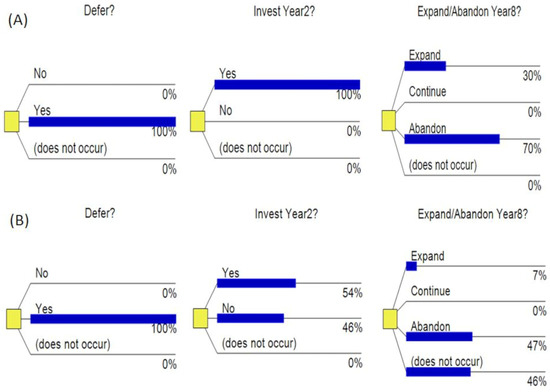 The option to expand the project should only be exercised when the market presents favorable conditions, which allows a greater investment to increase production [97,98]. Thus, the real probability of exercising the expansion option demonstrated that projects should be expanded only in the best scenarios (Figure 6A).