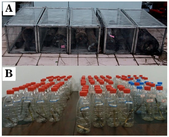 Collection and feeding of Monochamus alternatus. (A): Pine trees were cut into logs and maintained in outdoor insect cages, Monochamus alternatus were collected daily (every 8 h) during the period of adult beetle emergence. (B): The collected Monochamus alternatus were put into small bottles and fed with fresh twigs of pine.