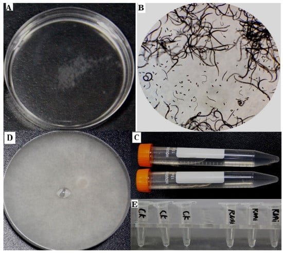 PWN culture and RNAi. (A): The PWN suspension was placed in a dish, and the eggs adhering to the bottom of the dish were collected every 6 h. (B): Eggs adhering to the bottom of the dish. (C): The collected PWN eggs were placed in an Eppendorf tube and incubated at 25 °C for 36 h. All the eggs hatched into second-stage PWN. (D): The second-stage PWN juvenile suspension was inoculated into the freshly grown Botrytis cinerea medium and cultured for 48 h (when the majority of nematodes were 4th stage juveniles). (E): RNAi was performed on PWN at 25 °C (immersion method).