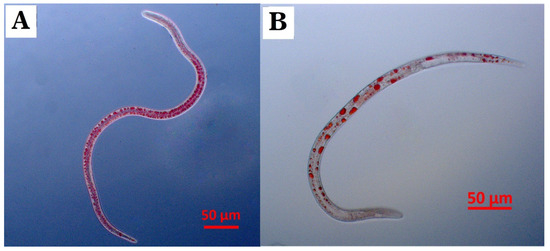After 48 h of RNAi, differences of PWN motility were observed, with videos being taken under a microscope (Zeiss Axio lmager.M2, Carl Zeiss, Gottingen, Germany). After 48 h of RNAi, the lipids of PWN were stained with oil red O []. PWN was washed with M9 buffer in a 1.5-mL Eppendorf tube and allowed to stand for 10 min at 4 °C, then the supernatant was discarded and the washing was repeated once. The lipids of PWN were fixed with 4% paraformaldehyde at 4 °C for 30 min, frozen at −80 °C refrigerator for 15 min, then rapidly thawed in a 43 °C water bath. The sample was centrifuged for 1 min with 2000× g, and the supernatant was discarded. The sample was washed three times with 1× phosphate-buffered saline (PBS) (pH 7.2–7.4), after which the PBS was discarded, and soaked in 1% Triton X-100 and isopropanol oil red O saturated solution (ratio 2:3) for 30 min. The sample was washed three more times with PBS (1×), clearly differentiated under the microscope using 60% isopropanol, and photographed (Zeiss Axio lmager.M2, Carl Zeiss, Gottingen, Germany).