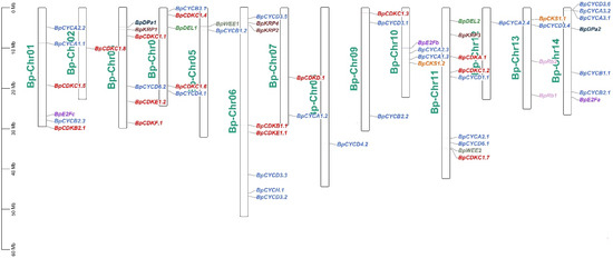 There are many regulators of the cell cycle in plants; most of them have special serine/threonine protein kinase activity, since they bind to cyclins to function, and are named as cyclin dependent kinases (CDKs). According to their structural and functional similarities with animal and yeast CDKs and their conserved PSTAIRE domains that bind to cyclins, plants CDKs were divided into eight groups: CDKA, CDKB, CDKC, CDKD, CDKE, CDKF, CDKG, and CDKLIKE [4,20]. In this study, we identified five groups of CDKs: BpCDKA, BpCDKB, BpCDKC, BpCDKD, BpCDKE, and BpCDKF. CDKA.1 plays a key role in the process of leaf cell division and differentiation and the development of leaf [21]. CDKB1.1 can prolong hypocotyl cells, promote cotyledon cell development, and regulate stomatal development of Arabidopsis thaliana [2,22]. The mutation of CDKB2 has been shown to impact meristem seriously [23].