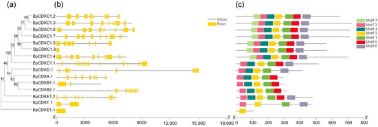 Phylogenetic analysis; exon/Intron genomic structure and protein motif organization of CDK in B. pendula. An unrooted phylogenetic tree was constructed using MEGA5.05 by the neighbor-joining method. Gene structure of the corresponding BpCDKs genes, TBtools software was used to visualize the gene structure. The yellow boxes represent exons and grey lines represent introns. Use MEME web server to analyze the distribution of conserved motifs in BpCDKs protein. The protein motif figure of BpCDKs was constructed by TBtools software. (a) Phylogenetic analysis of BpCDKs; (b) exon/intron genomic structure of BpCDKs; (c) protein motif organization of BpCDKs.