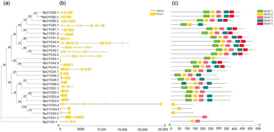 Phylogenetic analysis; exon/intron genomic structure and protein motif organization of CYC in B. pendula. An unrooted phylogenetic tree was constructed using MEGA5.05 by the neighbor-joining method. Gene structure of the corresponding BpCYCs genes, TBtools software was used to visualize gene structure. The yellow boxes represent exons and grey lines represent introns. Use MEME web server to analyze the distribution of conserved motifs in BpCYCs protein. The protein motif figure of BpCYCs was constructed by TBtools software. (a) Phylogenetic analysis of BpCYCs; (b) exon/intron genomic structure of BpCYCs; (c) protein motif organization of BpCYCs.