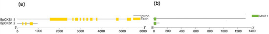 CDK subunit (CKS) proteins act as docking factors that mediate the interaction of CDKs with putative substrates and regulatory proteins. There are two CDK subunit genes in Arabidopsis described previously [4]. In a large amount of experimental data, we found two BpCKSs in the B. pendula genome (Figure 4). It can be seen that these two genes have the same motif, but their gene structures are quite different.