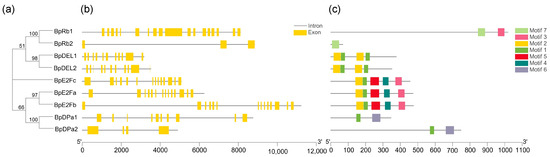 Phylogenetic analysis; exon/Intron genomic structure and protein motif organization of E2F, DP, DEL, and Rb in B. pendula. An unrooted phylogenetic tree was constructed using MEGA5.05 by the neighbor-joining method. Gene structure of the corresponding BpE2Fs, BpDPs, BpDELs, and BpRbs genes, TBtools software was used to visualize gene structure. The yellow boxes represent exons and grey lines represent introns. Use MEME web server to analyze the distribution of conserved motifs in BpE2Fs, BpDPs, BpDELs, and BpRbs protein. The protein motif figure of BpE2Fs, BpDPs, BpDELs, and BpRbs was constructed by TBtools software. (a) Phylogenetic analysis of BpE2Fs, BpDPs, BpDELs and BpRbs; (b) exon/intron genomic structure of BpE2Fs, BpDPs, BpDELs, and BpRbs; (c) protein motif organization of BpE2Fs, BpDPs, BpDELs, and BpRbs.