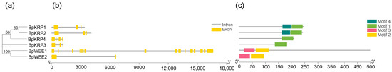 Phylogenetic analysis; exon/Intron genomic structure and protein motif organization of KRP and WEE in B. pendula. An unrooted phylogenetic tree was constructed using MEGA5.05 by the neighbor-joining method. Gene structure of the corresponding BpKRPs, BpWEEs genes, TBtools software was used to visualize gene structure. The yellow boxes represent exons and grey lines represent introns. Use MEME web server to analyze the distribution of conserved motifs in BpKRPs, BpWEEs protein. The protein motif figure of BpKRPs, BpWEEs was constructed by TBtools software. (a) Phylogenetic analysis of BpKRPs, BpWEEs; (b) exon/intron genomic structure of BpKRPs, BpWEEs; (c) protein motif organization of BpKRPs, BpWEEs.
